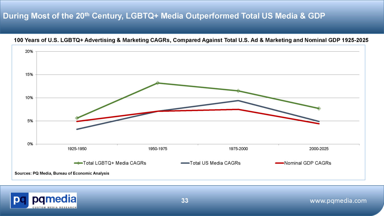 For much of the 21st century LGBTQ+ media had been outpacing overall ad & marketing growth, including during the two recessions in 2008-09 and 2020. However, brands began to pull back support for LGBTQ+ events in 2023 following the controversial boycott of Bud Light after it used a transgender actor in its Super Bowl ad. Organizations that run PRIDE festivals reported significant declines in corporate sponsorships in 2023 and 2024, which weakened in 2025 due to political pressure on companies to disband their DEI programs.