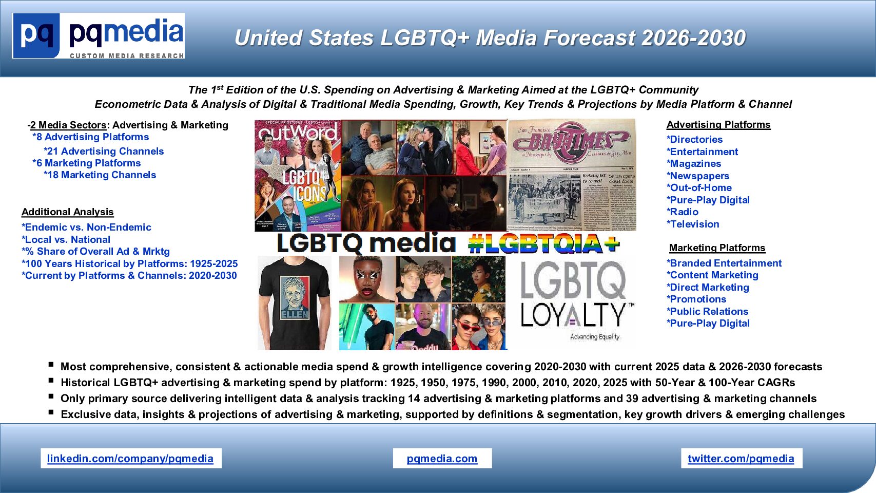 The Forecast also provides in-depth coverage of 14 LGBTQ+ media platforms, including 8 advertising and 6 marketing platforms, as well as 42 media channels, and 2 major media buying categories: endemic vs. non-endemic, and local vs. national. The new Forecast marks the first and only in-depth examination of the domestic LGBTQ+ media market ever done, highlighting the largest and fastest-growing media platforms and channels, while delivering exclusive strategic intelligence covering the entire 2020-2030 period. Also included in the report is a 100-history of the 14 LGBTQ+ media platforms from 1925-2025, in 10-25 year increments.
